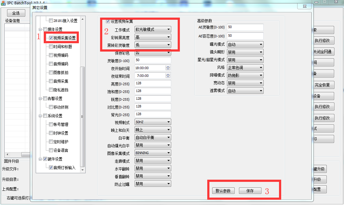 然后在快速配置工具中,打開配置其他參數(shù)<媒體設置<設置視頻采集,將工作模式調為軟光敏模式,彩轉黑亮度和黑轉彩靈敏度按照現(xiàn)場環(huán)境進行調節(jié)靈敏度為高時,燈光早亮,適合夜晚光線較暗的環(huán)境;靈敏度為低時,燈光晚亮適合于光線較為充足的環(huán)境,點擊保存將操作保存下來。