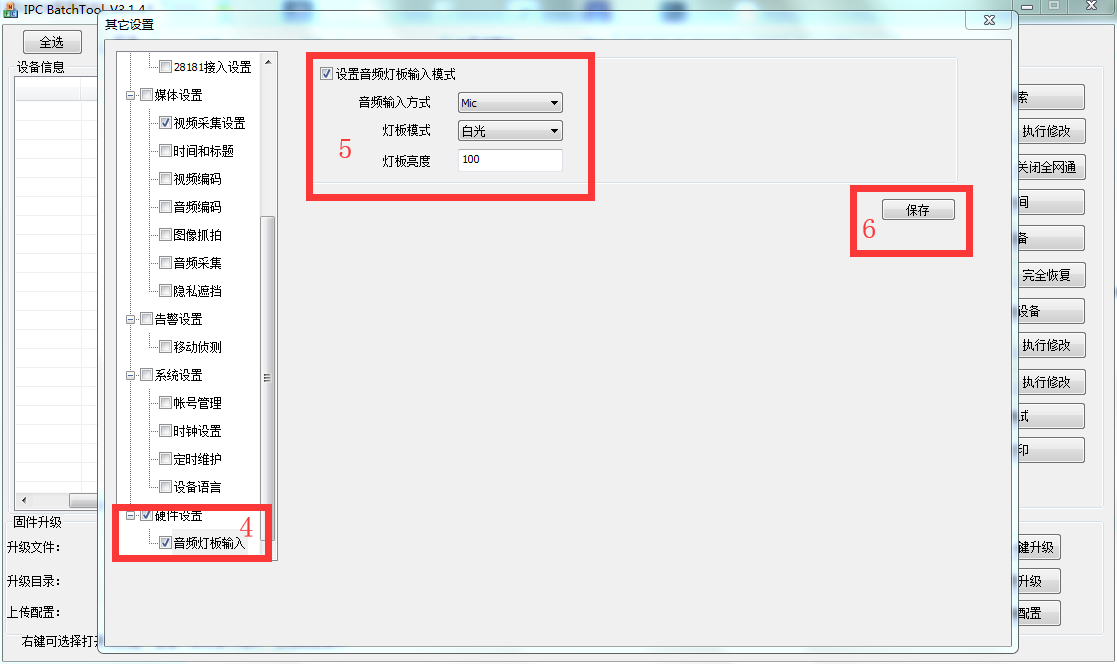 再點擊硬件設置,音頻燈板輸入燈板模式為白光,燈板亮度根據(jù)環(huán)境進行調節(jié)(100為燈光亮起時亮度達到燈板最亮值),再點擊保存。