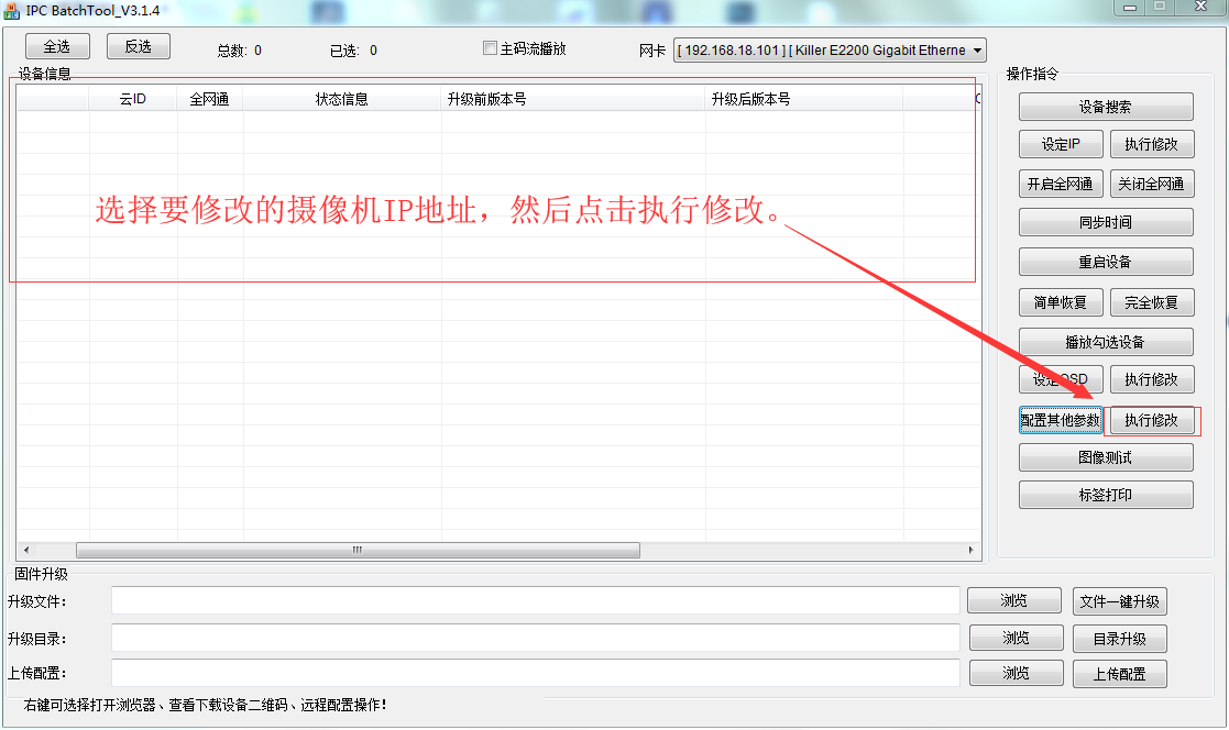 最后選擇要設置的攝像機的IP地址,點擊執(zhí)行修改這樣智能黑光網(wǎng)絡攝像機攝像機就能準確按照設置進行調節(jié)燈光是否開啟和燈光的亮度了。