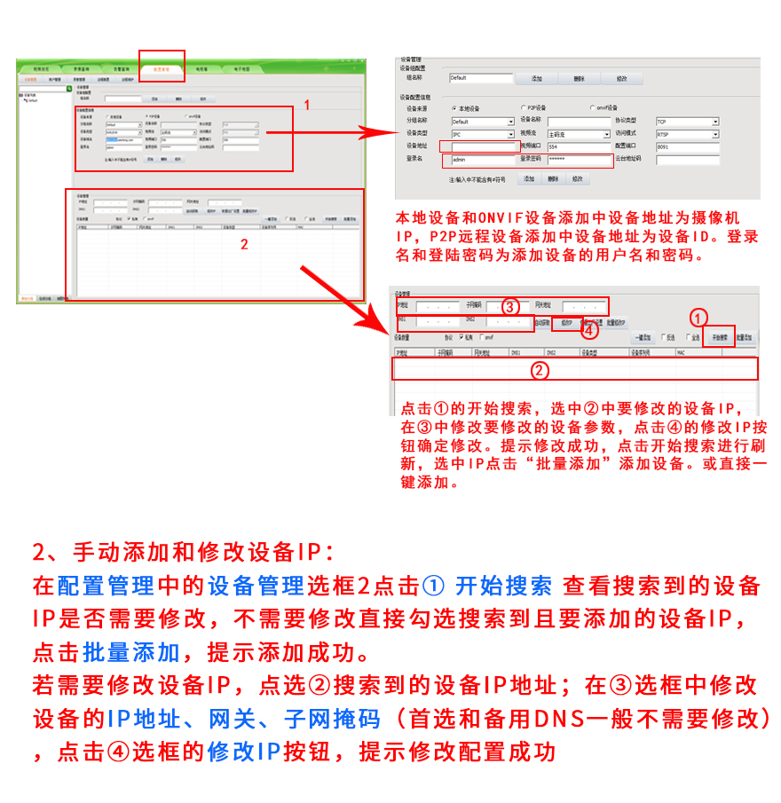 下面方法適用于開(kāi)寧超長(zhǎng)存儲(chǔ)網(wǎng)絡(luò)攝像機(jī).日夜全彩攝像機(jī).智能黑光全彩攝像機(jī)以及網(wǎng)絡(luò)硬盤(pán)錄像機(jī)的電腦客戶端修改和添加IP的使用方法: