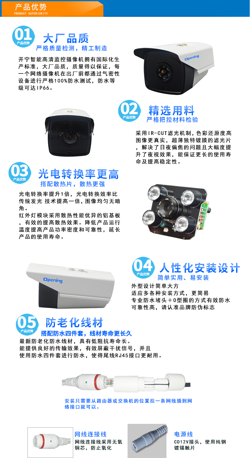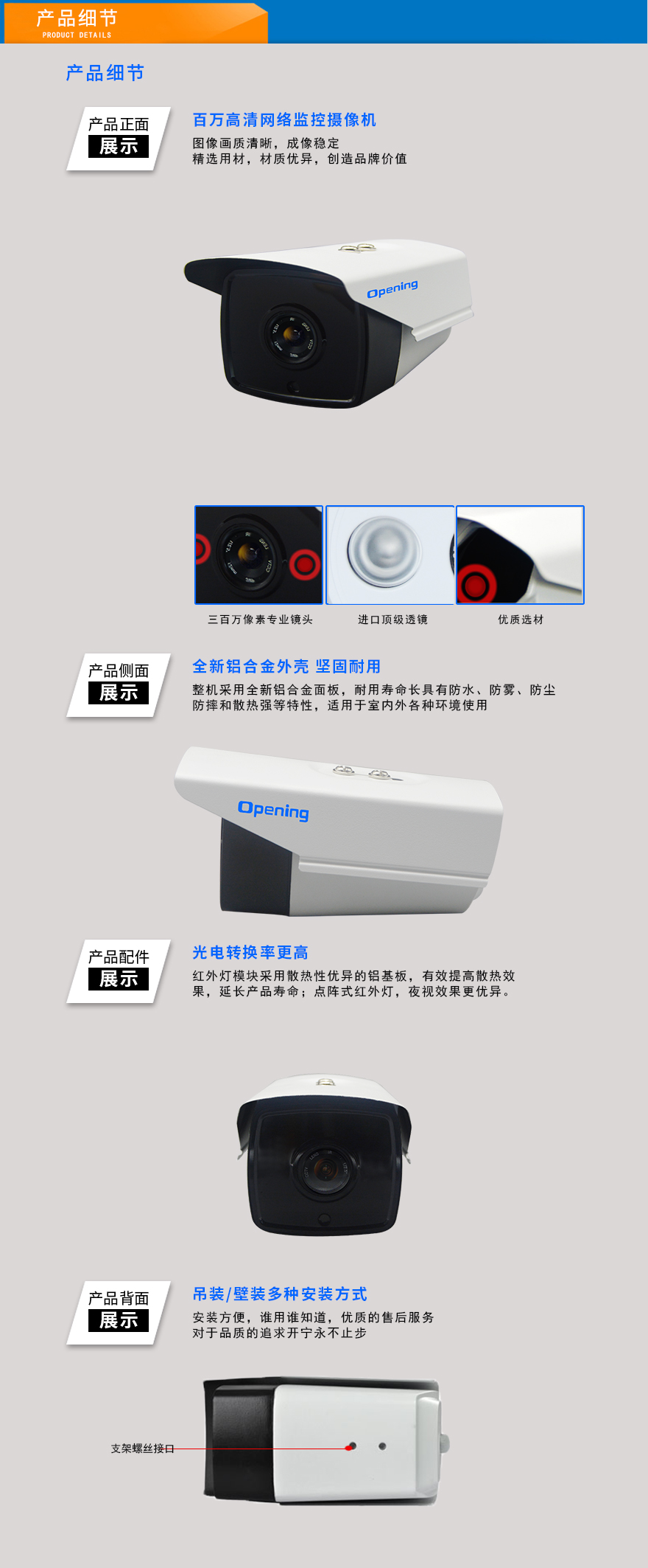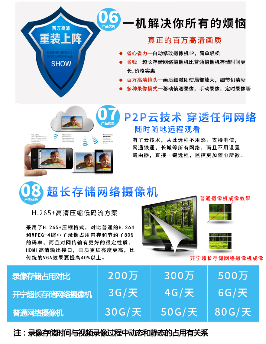 ★超長存儲、960P/1080P/1944P(130萬/200萬/500萬)、智能高清、全網(wǎng)通、低碼流、低照度、低功耗、H.264+/H.265+雙碼流、防靜電、防浪涌、過壓保護(hù)、移動偵測報警。