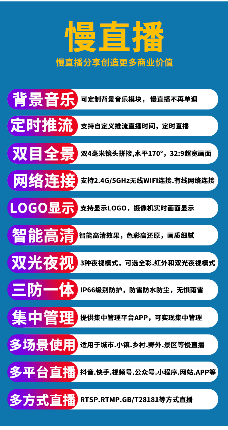 3、景點(diǎn)直播.美麗鄉(xiāng)村.城市慢直播.農(nóng)業(yè)慢直播.文旅慢直播.融媒體慢直播.戶外直播等慢直播;