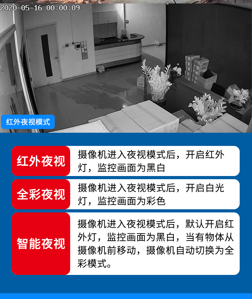 ★APP可選紅外模式、全彩模式或智能全彩模式三種模式中的一種;紅外模式-晚上則是黑白圖像,全彩模式-晚上則是彩色圖像,智能全彩模式-晚上正常是黑白,攝像頭前方有人或者物體移動(dòng)的情況下白光燈亮呈現(xiàn)彩色圖像;