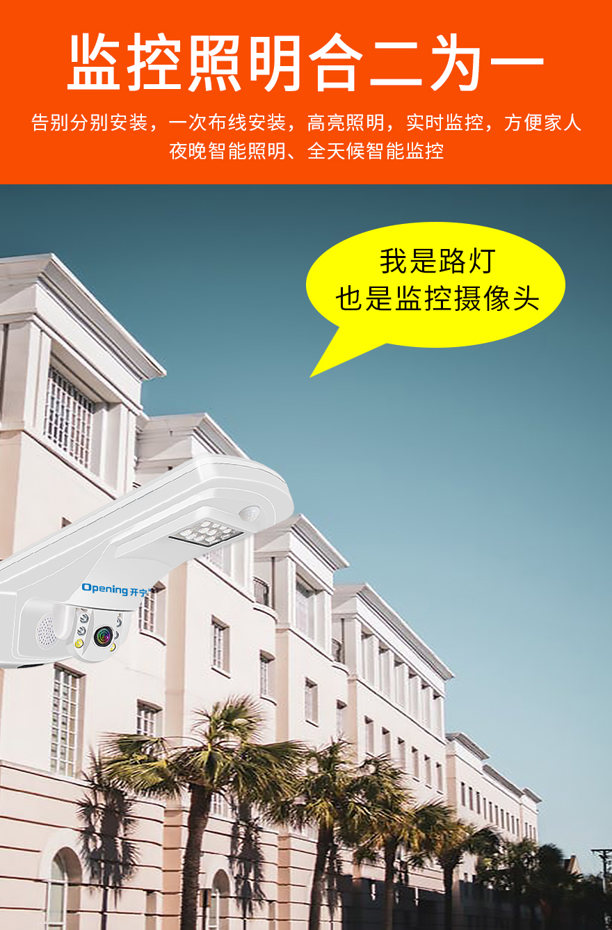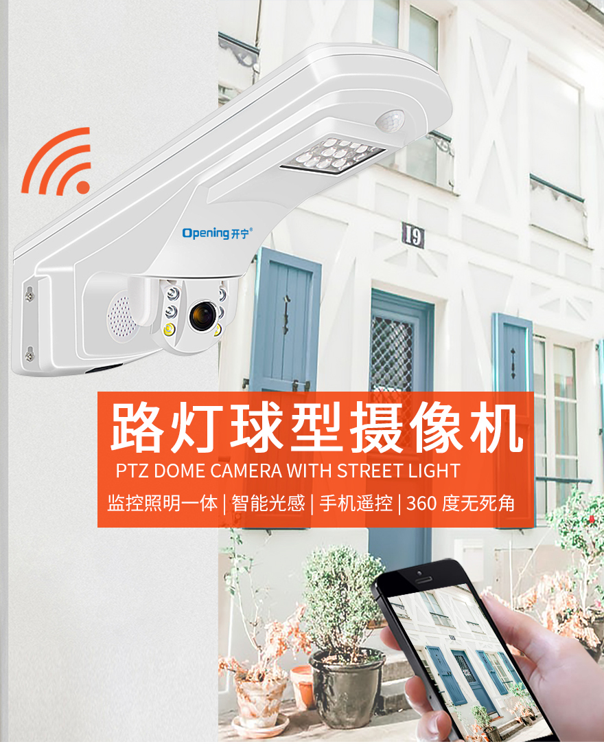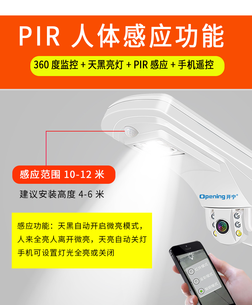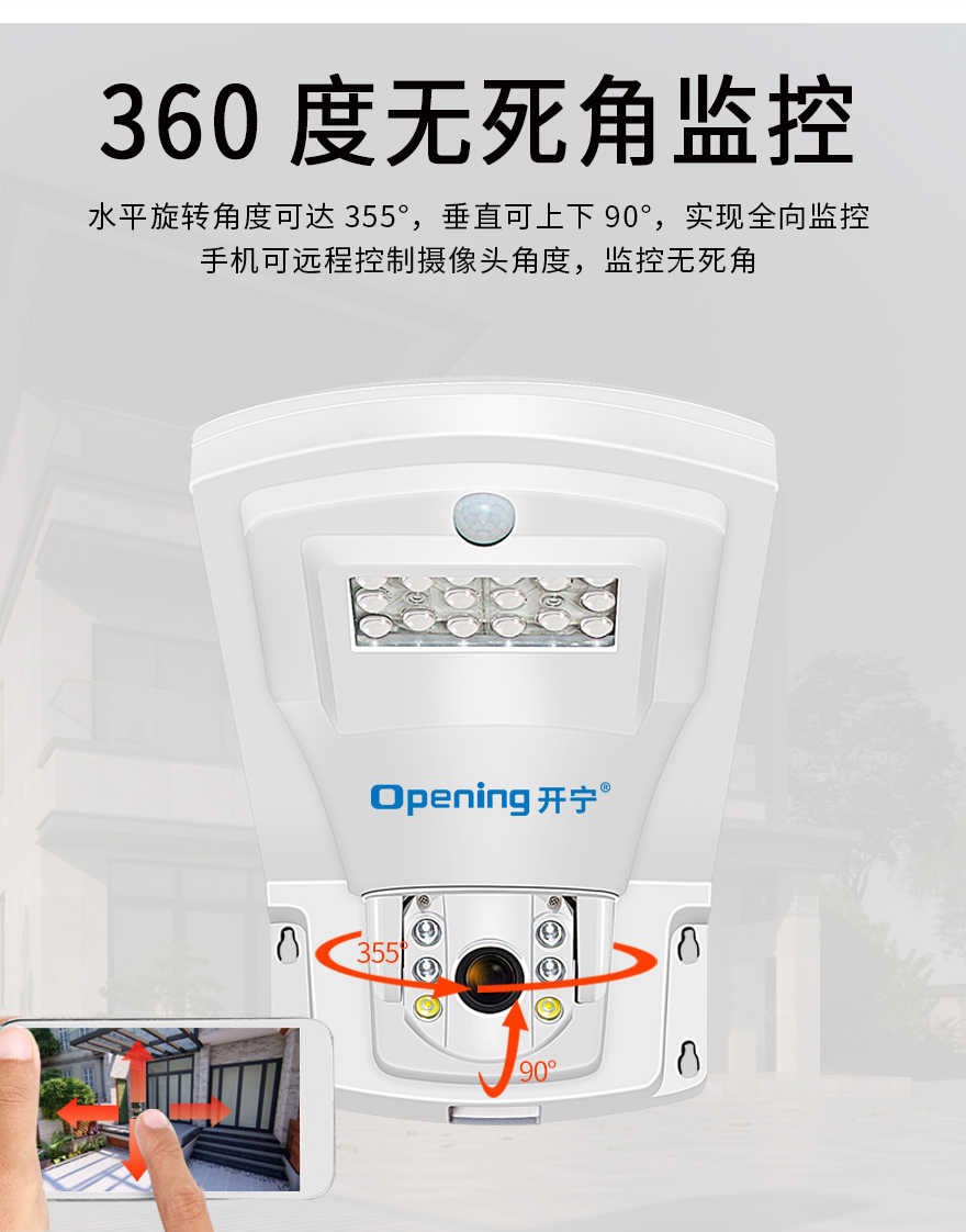 2、監(jiān)控照明一體設計,360度監(jiān)控+天黑亮燈+PIR感應+手機遙控;