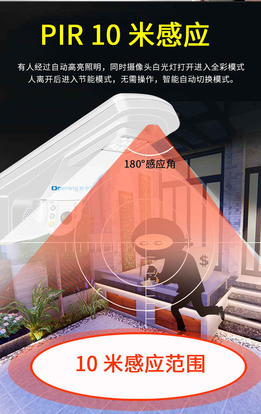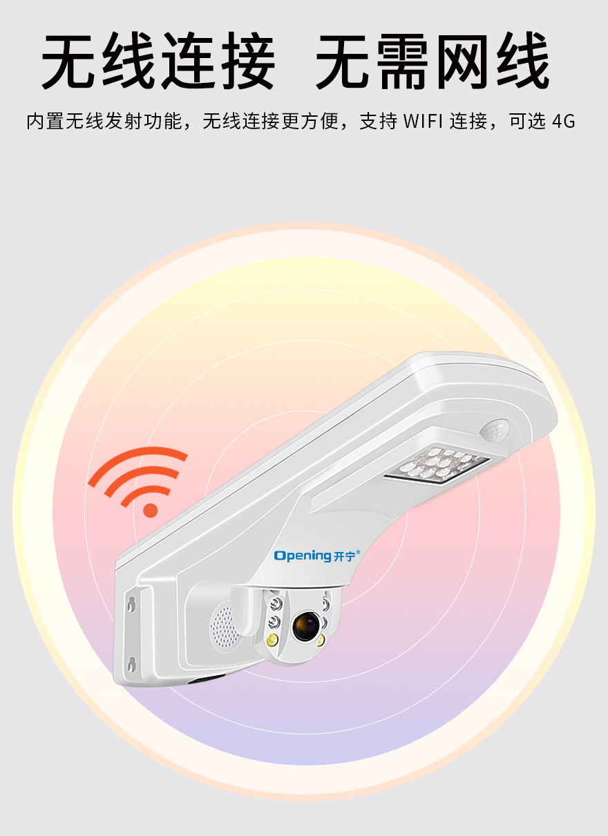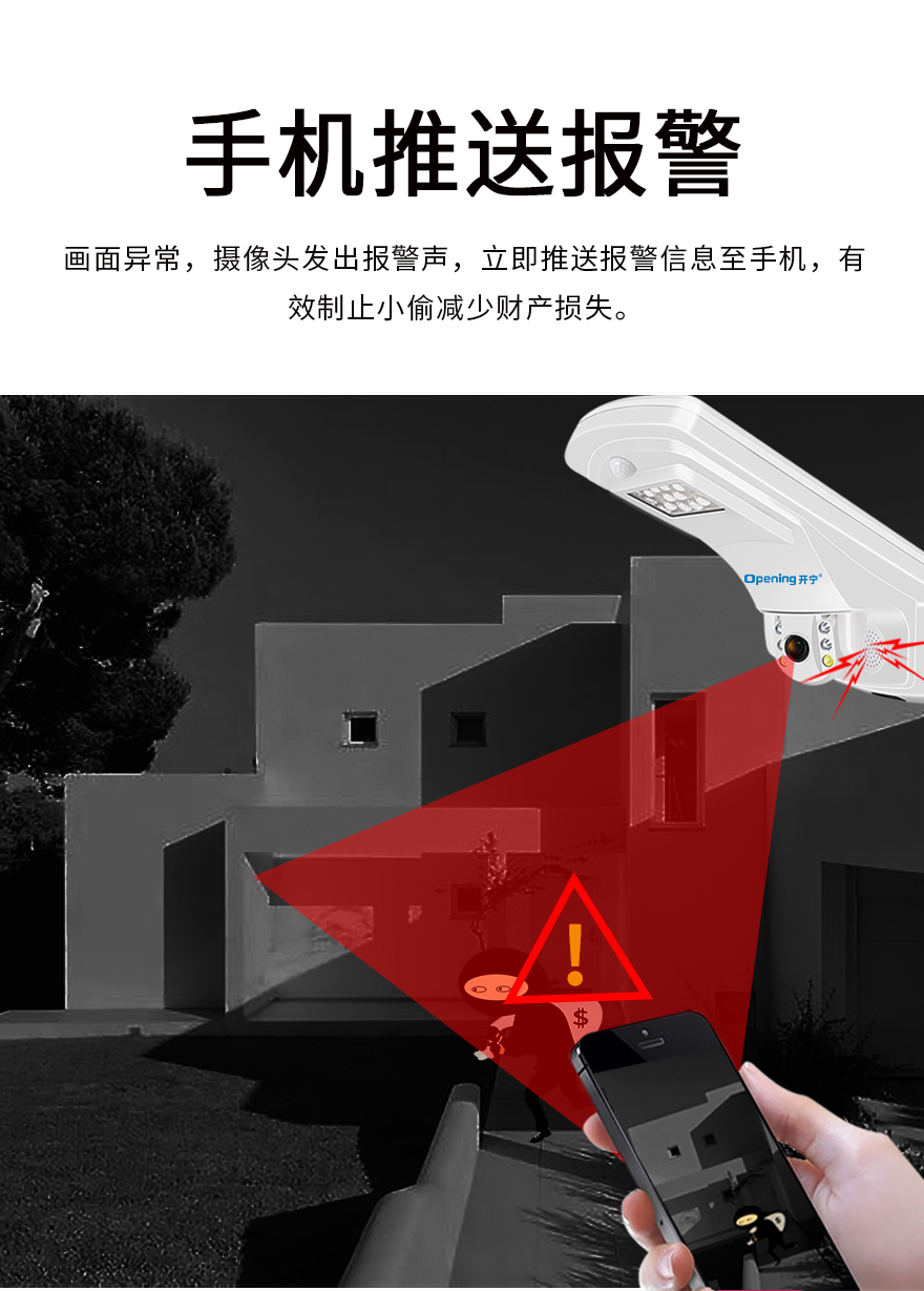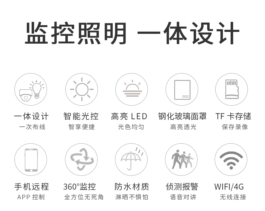 2、監(jiān)控照明一體設計,360度監(jiān)控+天黑亮燈+PIR感應+手機遙控;