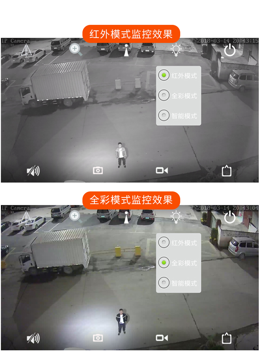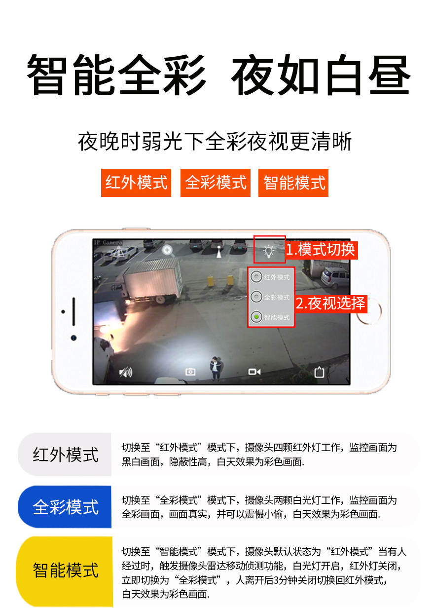 10、APP可選擇紅外模式、全彩模式和智能模式三種模式其中一種模式;