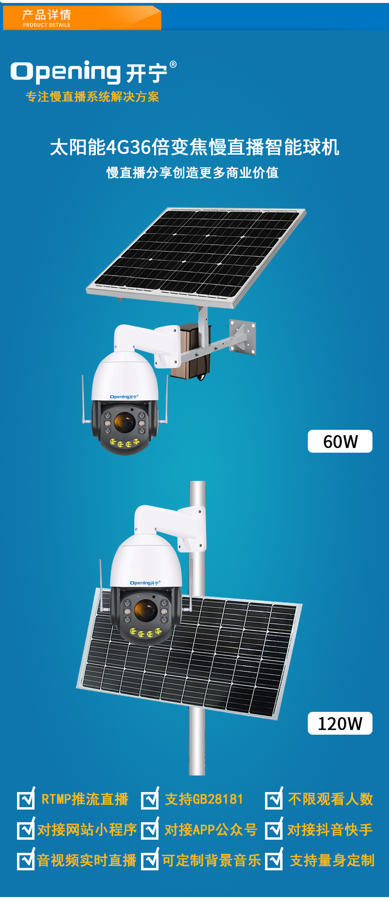 - 1、4G500萬/4K800萬4.5寸太陽能4G36倍變焦監(jiān)控直播智能球機(jī),一個球機(jī)就是一套慢直播系統(tǒng);支持360度旋轉(zhuǎn),36倍光學(xué)變焦,半金屬外觀,IP66防水等級;
