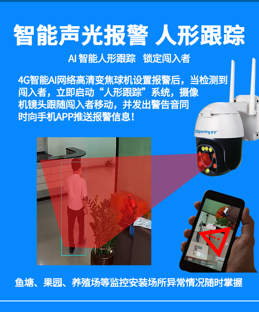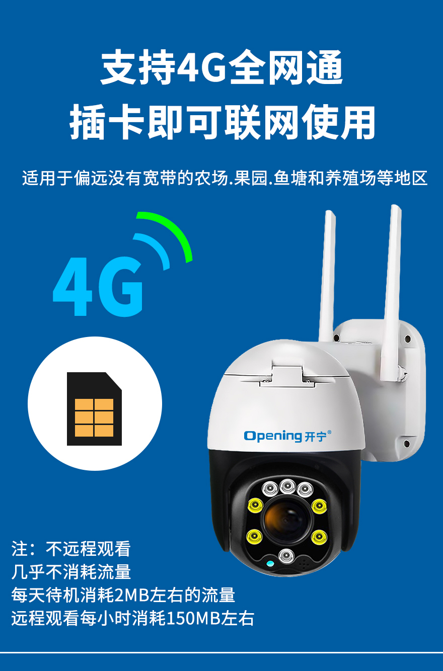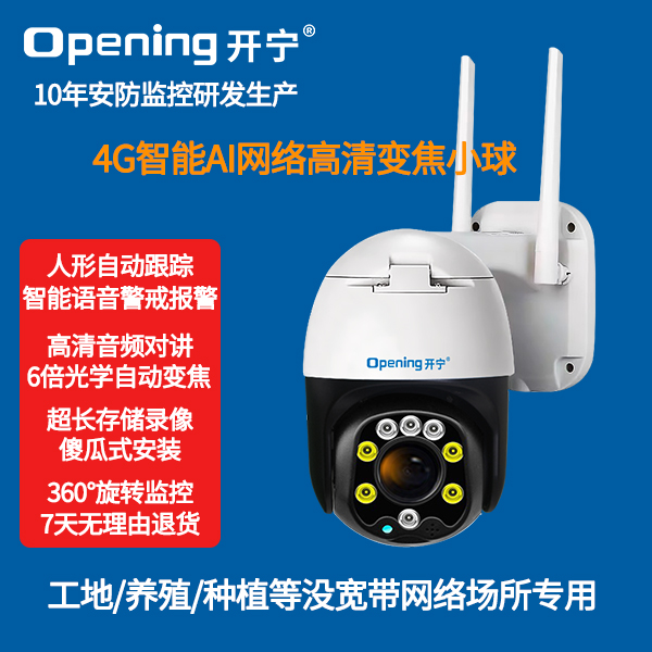 2、內(nèi)置智能4G模塊;適用場所:養(yǎng)殖/種植/工地/公園/公路/野外等沒網(wǎng)絡(luò)地方; 3、2.5寸6倍變焦小球,可拉遠(yuǎn)拉近;水平旋轉(zhuǎn):0°~320°,垂直旋轉(zhuǎn):0°~90°; 4、海思H.265壓縮算法,超長存儲錄像;最大支持256G存儲卡(30-60天左右錄像);