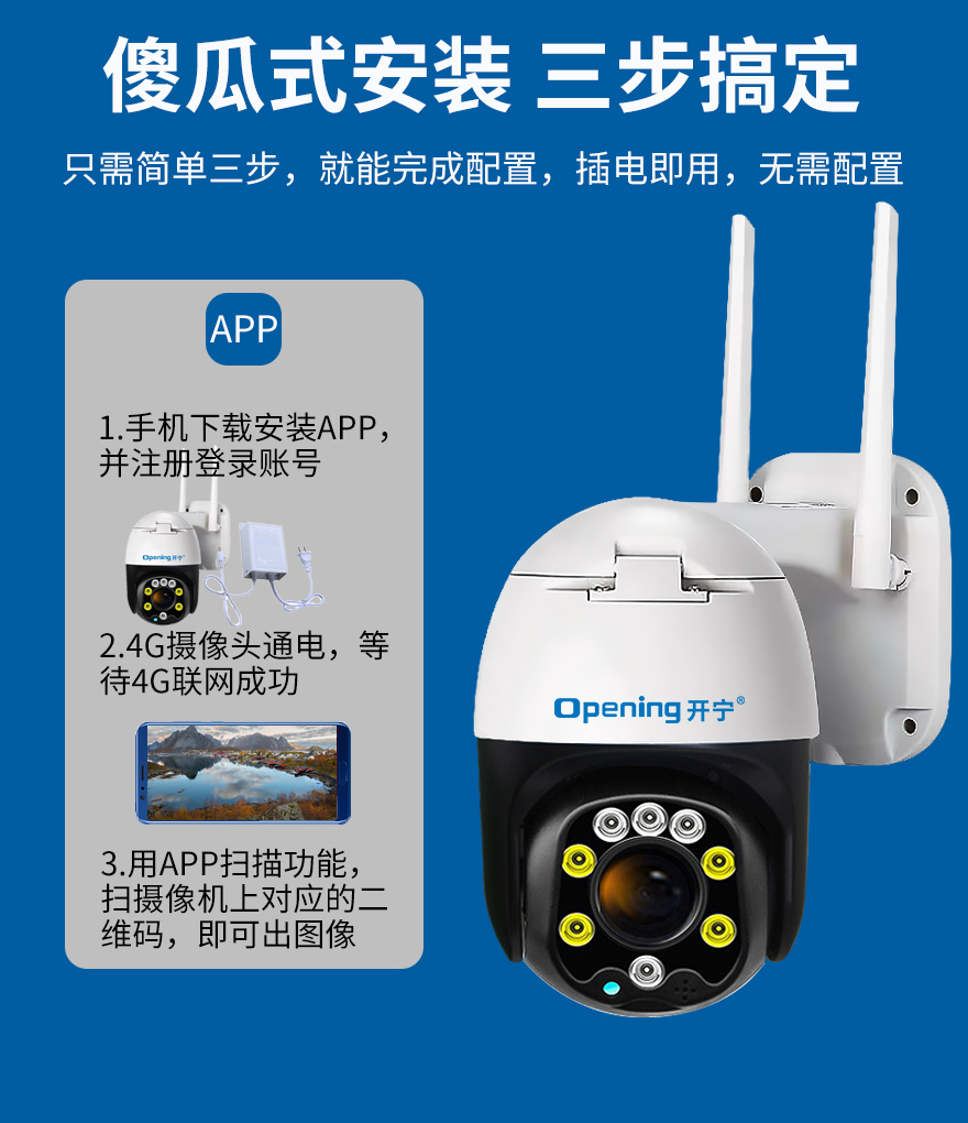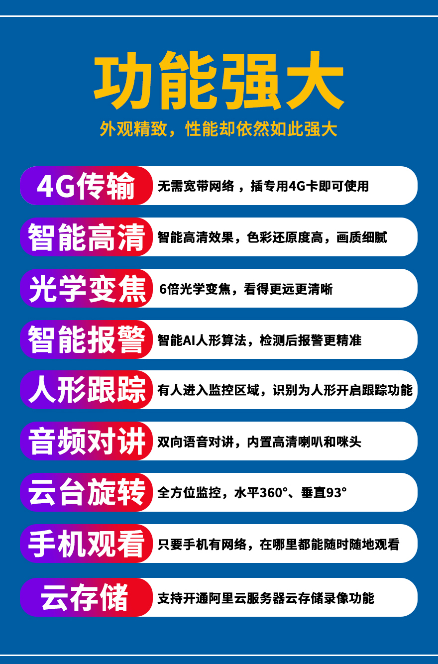 - 1、4G無線變焦智能全彩小球,一個(gè)小球就是1套監(jiān)控系統(tǒng);