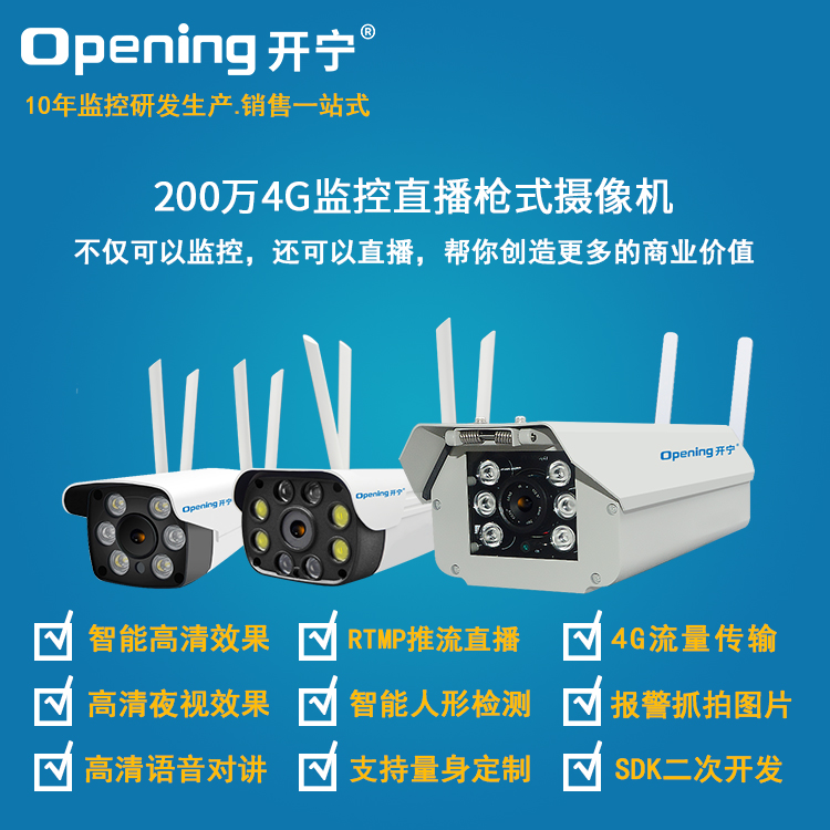 - 1、200萬/500萬4G智能監(jiān)控直播網(wǎng)絡(luò)高清防水?dāng)z像機(jī),一個(gè)攝像機(jī)就是一套監(jiān)控直播系統(tǒng);