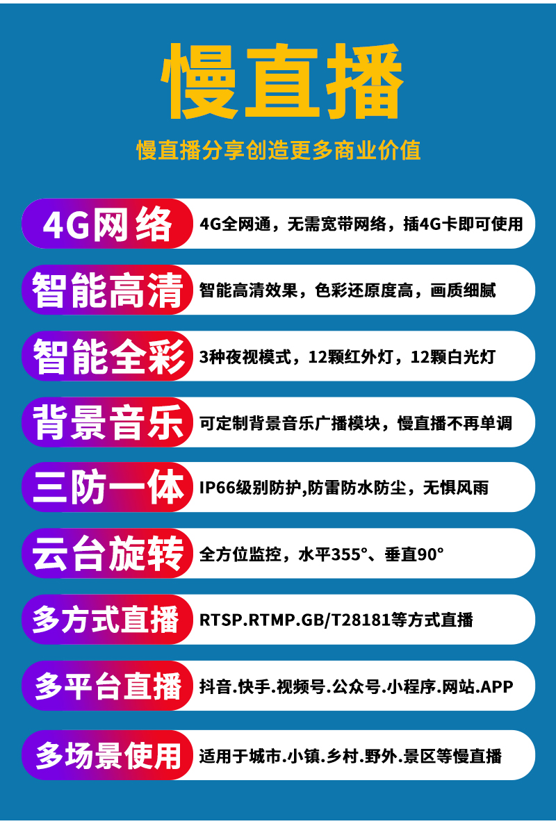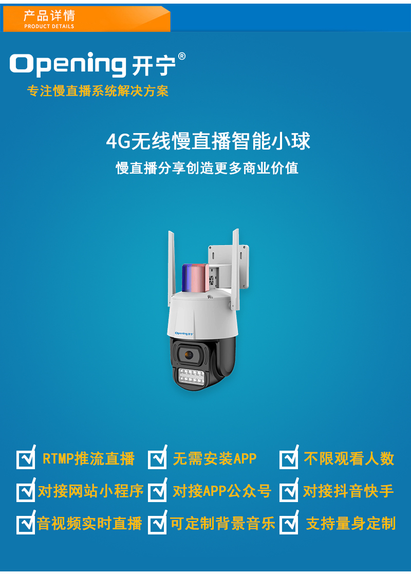 - 1、4G300萬(wàn)慢直播智能小球,一個(gè)小球就是一套慢直播系統(tǒng); 2、不僅可以監(jiān)控監(jiān)管,還可以實(shí)時(shí)慢直播分享創(chuàng)造更多商業(yè)價(jià)值; 3、明廚亮灶.食品溯源.城市慢直播.美麗鄉(xiāng)村.農(nóng)業(yè)慢直播.景點(diǎn)慢直播.戶(hù)外慢直播等慢直播; 4、無(wú)需下載安裝APP,簡(jiǎn)單實(shí)用;不限觀看人數(shù),創(chuàng)造更多商業(yè)價(jià)值; 5、RTMP推流直播高清攝像頭;可生成慢直播二維碼,只需掃碼即可觀看慢直播; 6、可接入網(wǎng)站.公眾號(hào).小程序.APP;可對(duì)接抖音.快手.視頻號(hào).淘寶.拼多多等平臺(tái); 7、支持GB28181協(xié)議;可接公安.食品.工地.生產(chǎn).教育.畜牧.旅游等監(jiān)管部門(mén)平臺(tái); 8、內(nèi)置智能4G模塊,沒(méi)有寬帶網(wǎng)絡(luò)的地方也能實(shí)現(xiàn)實(shí)時(shí)慢直播;另外支持有線功能; 9、支持64/128G/256G內(nèi)存卡;可另選配太陽(yáng)能供電系統(tǒng)實(shí)現(xiàn)無(wú)電無(wú)網(wǎng)實(shí)時(shí)慢直播; 10、12顆高效能點(diǎn)陣紅外燈,12顆高效能點(diǎn)陣白光燈,鏡頭4MM/6MM可選,夜視5-50米; 11、APP可選擇紅外模式、全彩模式和智能模式三種模式其中一種模式; 12、智能模式,沒(méi)有物體移動(dòng)紅外燈亮,有物體移動(dòng)白光燈亮; 13、內(nèi)置高清拾音器,有聲有色實(shí)時(shí)直播;高清晰喇叭,APP語(yǔ)音對(duì)講,語(yǔ)音警戒報(bào)警;DC12V供電; 14、免費(fèi)提供集中管理平臺(tái),可實(shí)現(xiàn)集中管理慢直播攝像頭,有效提高工作效率;