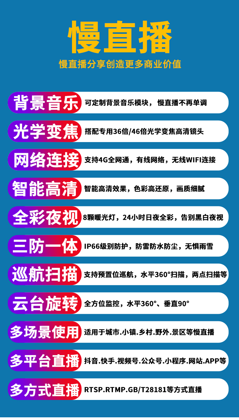 - 1、500萬(wàn)/800萬(wàn)7寸4G全彩慢直播智能球機(jī),一個(gè)球機(jī)就是一套慢直播系統(tǒng);支持360度旋轉(zhuǎn),36倍/46倍光學(xué)變焦,金屬外觀,IP66防水等級(jí);