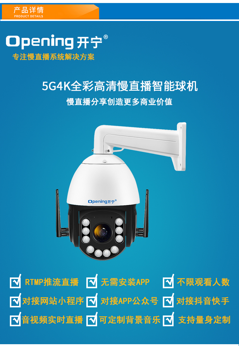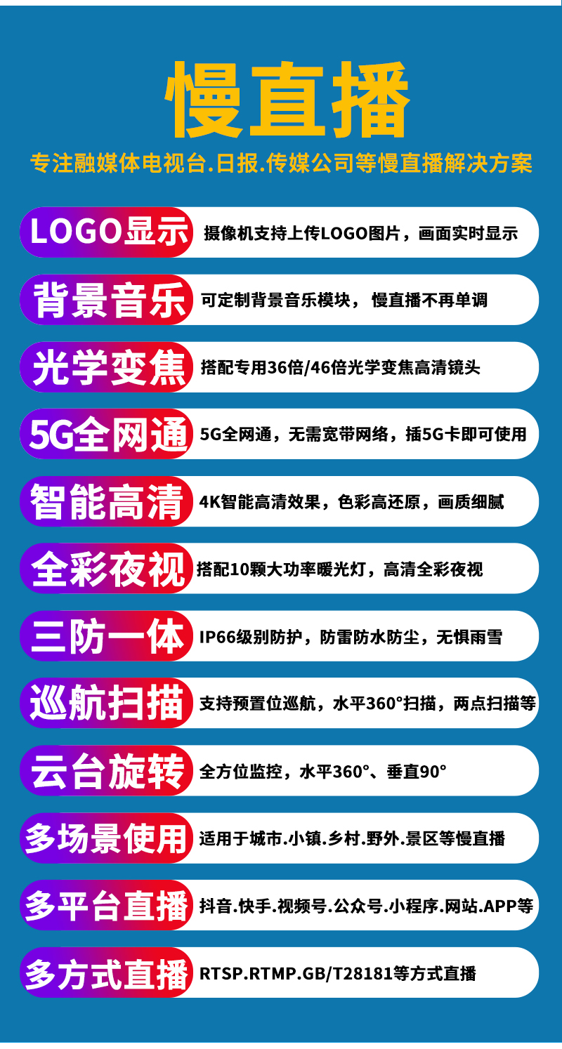 - 1、500萬/800萬6寸5G全彩慢直播智能球機,一個球機就是一套慢直播系統(tǒng);支持360度旋轉(zhuǎn),36倍/46倍光學變焦,半金屬外觀,IP66防水等級;