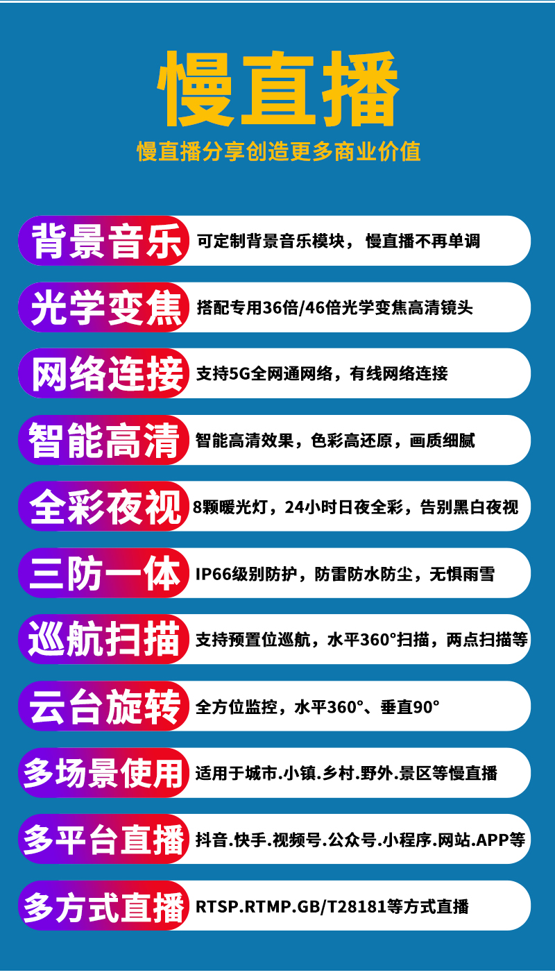 - 1、500萬/800萬7寸5G全彩慢直播智能球機,一個球機就是一套慢直播系統(tǒng);支持360度旋轉(zhuǎn),36倍/46倍光學(xué)變焦,金屬外觀,IP66防水等級;