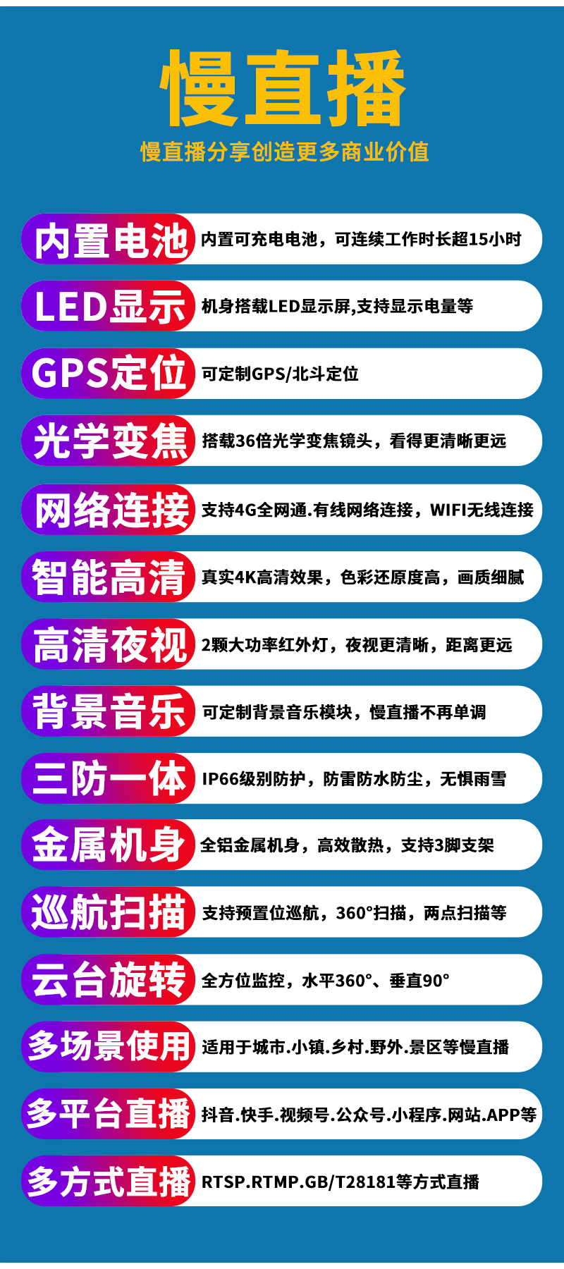 - 1、4K800萬4G紅外慢直播智能高清布控球,一個(gè)布控球就是一套完整的慢直播系統(tǒng);支持360度水平及90度垂直旋轉(zhuǎn),36倍光學(xué)變焦高清鏡頭,全金屬外觀,IP66防水等級(jí);內(nèi)置大容量鋰電池,連續(xù)工作時(shí)長超過15小時(shí);配置便攜式牢固金屬三腳架;可滿足臨時(shí)快速搭建慢直播系統(tǒng)搭建需求;