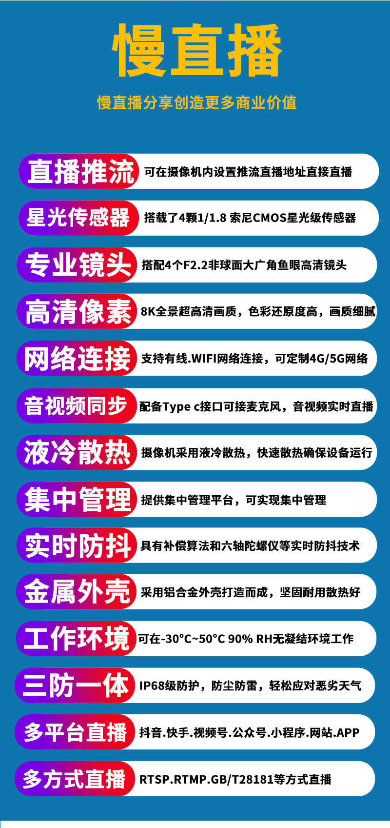 7.直播分辨率:7680*3840@30幀 ;5400*2700@30幀;3840*1920@30幀@60幀,支持H.265/H.264編碼,RTMP/RTMPS/RTSP直播協(xié)議,支持7x24小時(shí);