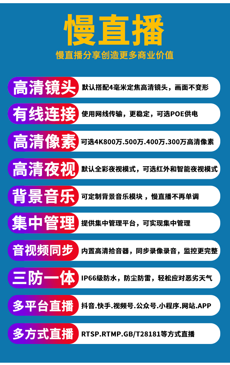 - 1、300萬/500萬/800萬/1200萬雙光慢直播高清攝像機(jī),一個(gè)攝像機(jī)就是一套慢直播系統(tǒng);