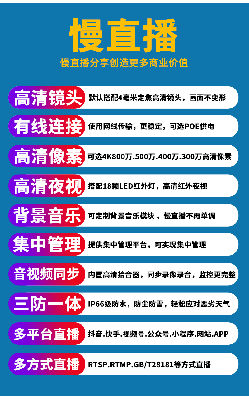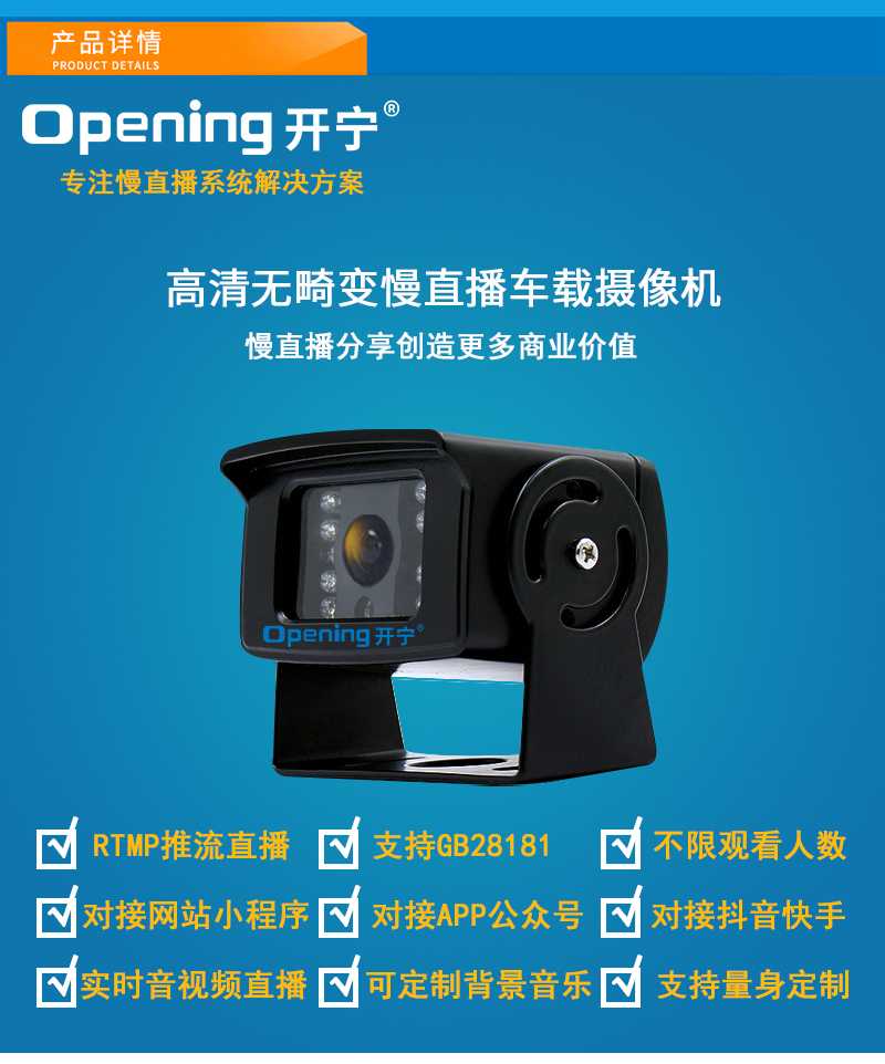 - 1、300萬/500萬/800萬紅外高清無畸變車載慢直播高清攝像機(jī),一個(gè)攝像機(jī)就是一套慢直播系統(tǒng);