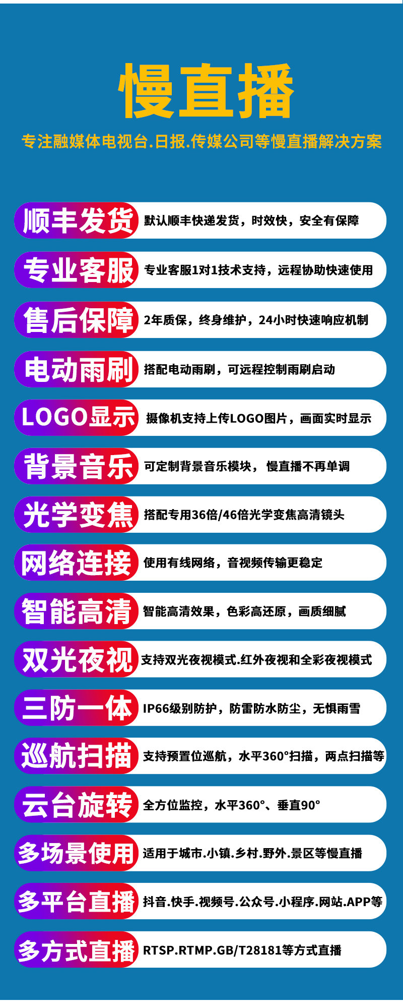 - 1、800萬(wàn)4K6寸金屬36倍/48倍全彩慢直播智能高清球機(jī),一個(gè)球機(jī)就是一套慢直播系統(tǒng);支持360度旋轉(zhuǎn),最高轉(zhuǎn)速可達(dá)60度/S,支持預(yù)置點(diǎn)和巡航,36倍/48倍光學(xué)變焦,半金屬外觀,IP66防水等級(jí);支持雨刮功能;