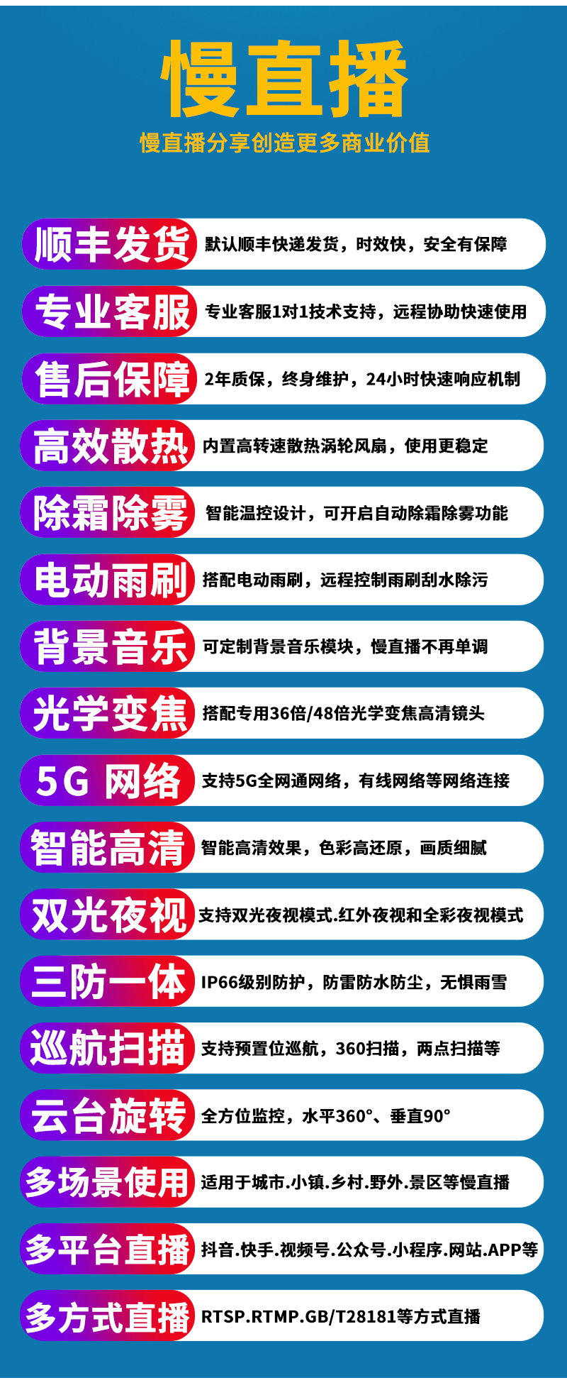 - 1、4K800萬6寸5G全彩慢直播智能球機,一個球機就是一套慢直播系統(tǒng);水平360度無限位旋轉(zhuǎn),垂直100度旋轉(zhuǎn);支持256個預(yù)置位 8組巡航8組掃描,支持水平掃描,2點區(qū)域掃描,隨機掃描;36倍/48倍光學(xué)變焦,半金屬外觀,IP66防水等級;